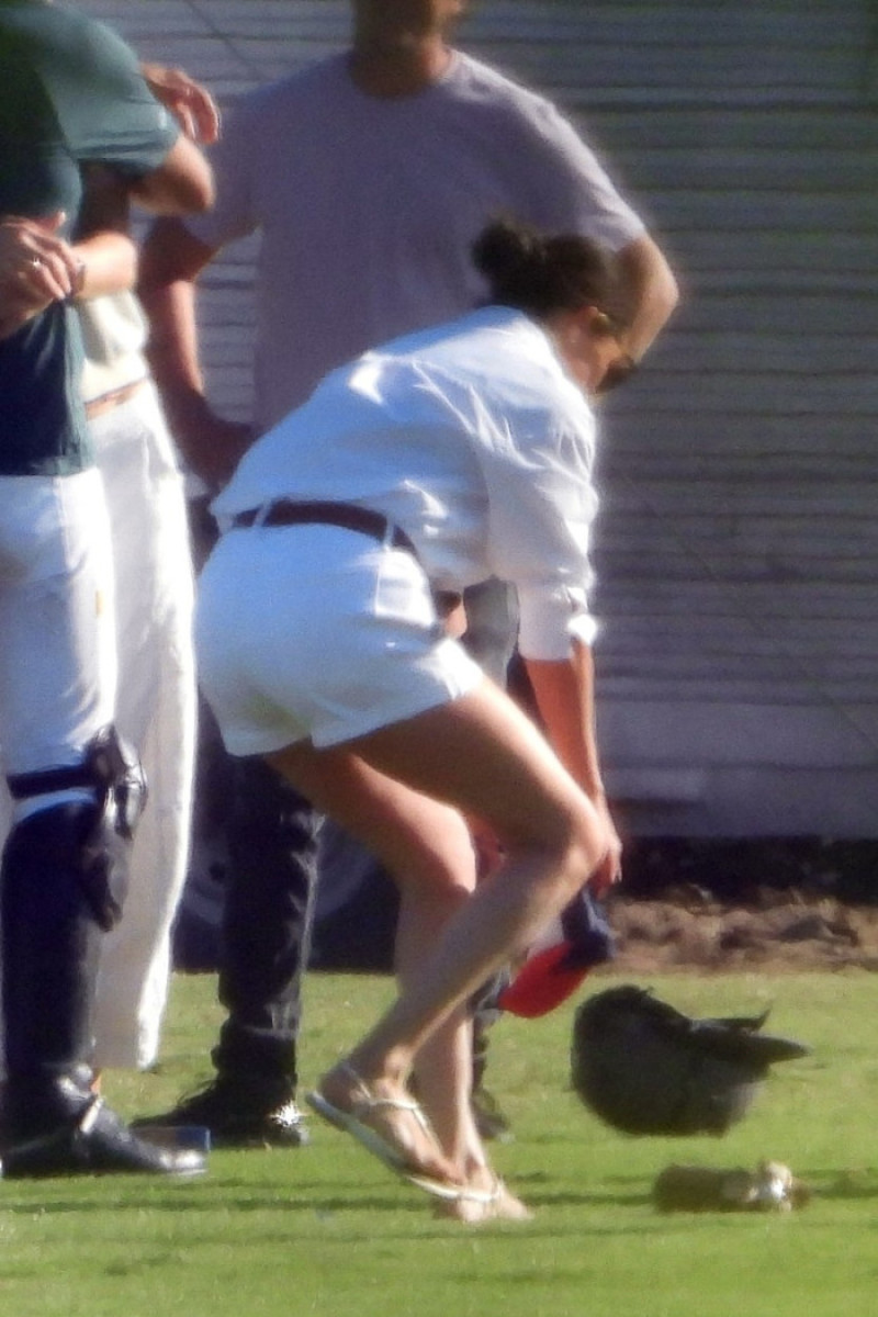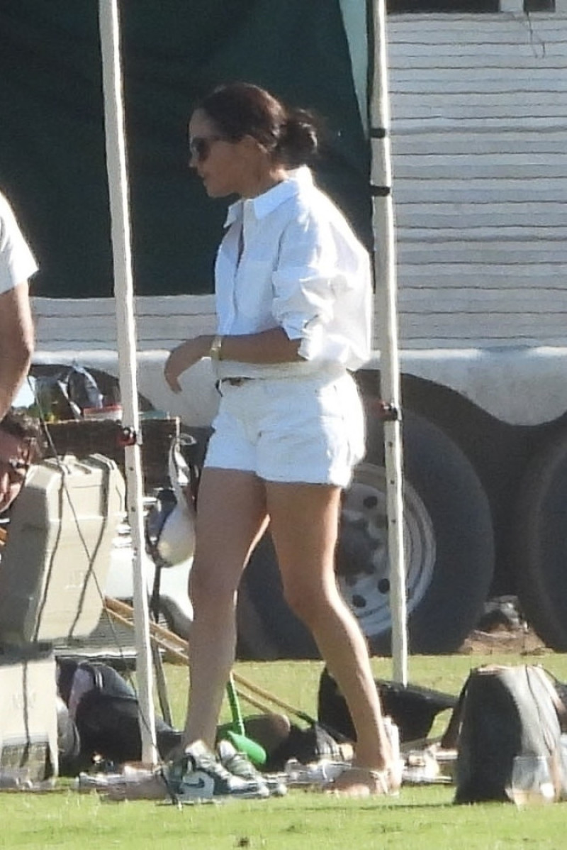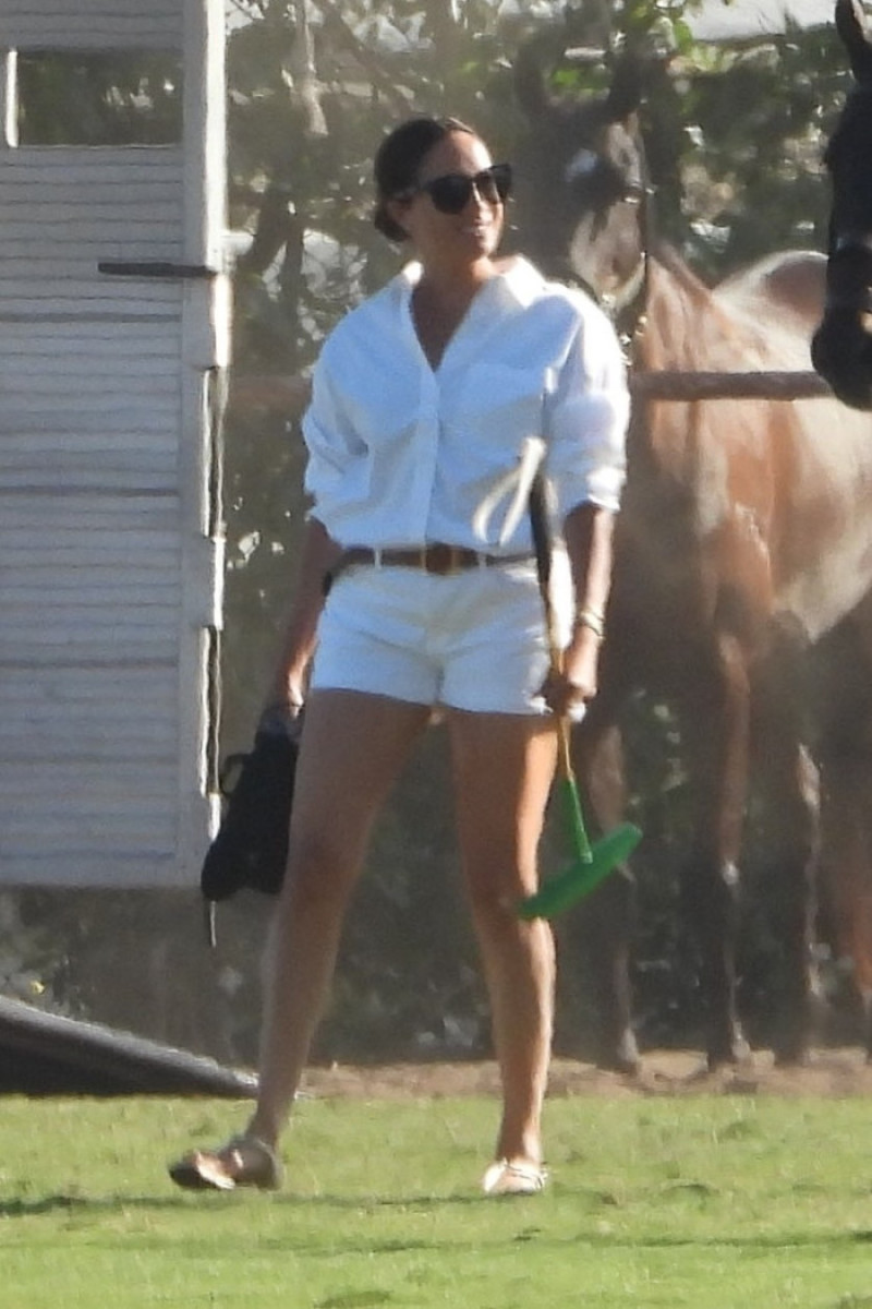 Două zile la rând, fosta actriță a fost văzută în timp ce-i făcea galerie soțului ei la meciuri de polo călare. De fiecare dată s-a îmbrăcat în pantaloni scurți și cămăși lejere, ținute asortate cu sandale comode, numai bune pentru a se potrivi căldurii din California. Un outfit din denim și unul complet alb au fost alegerile lui Meghan. Nu a uitat de ochelarii de soare, machiajul foarte discret și părul prins.