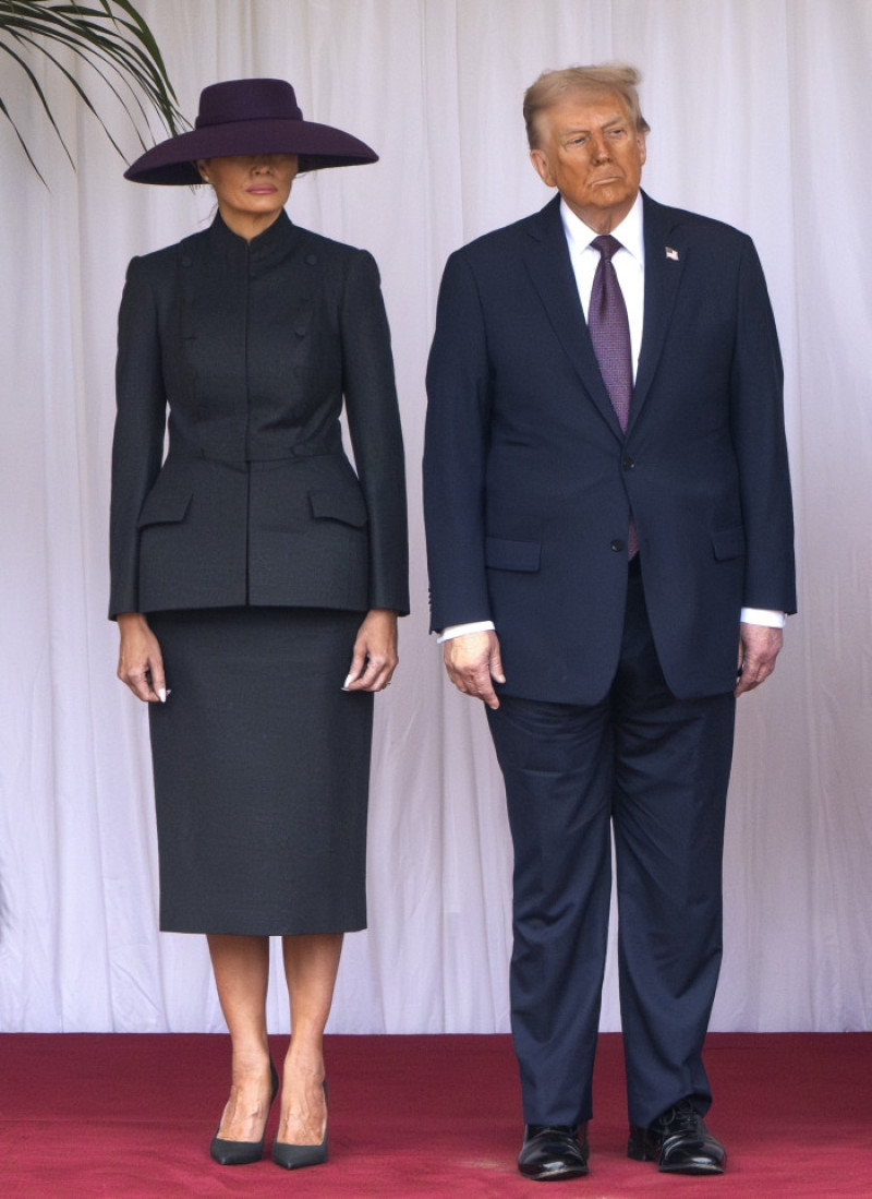 Când a sosit miercuri la Castelul Windsor, prima-doamnă a purtat un costum Dior de culoare închisă cu fustă şi o pălărie cu boruri largi, de culoare mov închis. Pălăria a blocat vizibilitatea unei mari părţi a chipului său, amintind de look-ul ei din ziua învestirii, care era foarte business.