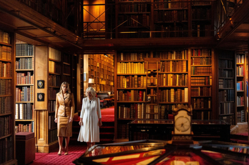 Regina Camilla şi Melania Trump au vizitat de asemenea Biblioteca Regală de la Castelul Windsor, fondată de Regele William al IV-lea în anul 1837 în trei săli ale apartamentelor de Stat. Această bibliotecă găzduieşte peste 200.000 de exemplare de cărţi vechi despre literatură, muzică, istorie, antichitate, ştiinţă, religie şi drept, precum şi monede, medalii, decoraţii şi insigne.