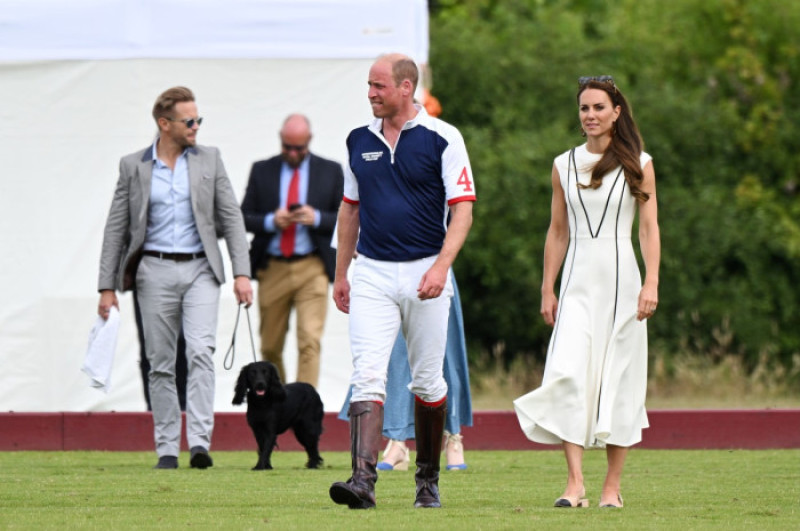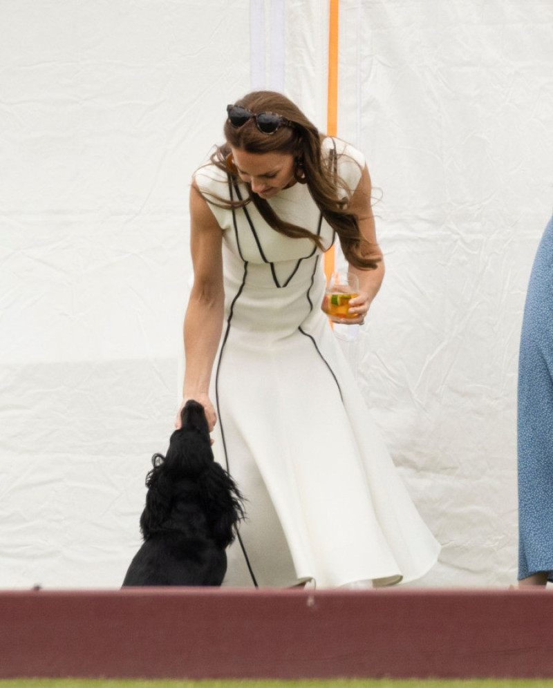 Ducesa de Cambridge și-a îndreptat atenția și spre Orla, câinele familiei, pe care l-a adus cu ea la evenimentul sportiv. Îmbrăcată într-o rochie albă, mulată pe siluetă și lejeră în partea de jos, decorată cu câteva dungi negre, Kate a accesorizat cu o pereche de ochelari de soare pe care i-a purtat ba la ochi, ba pe cap.