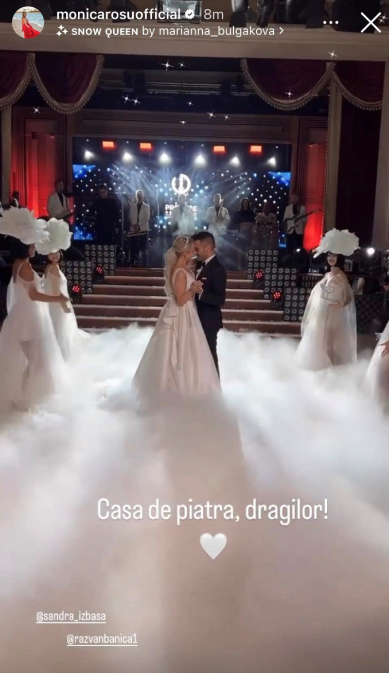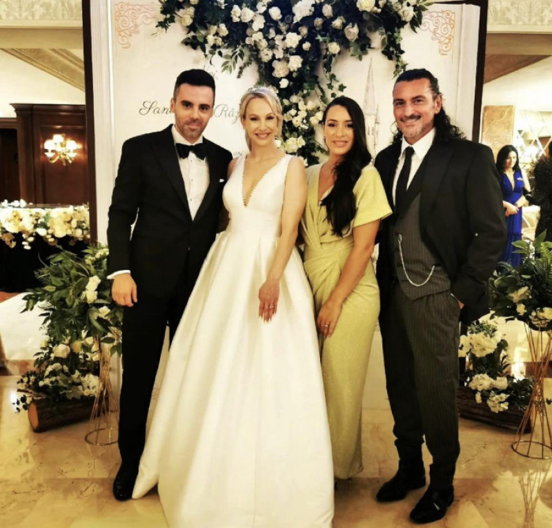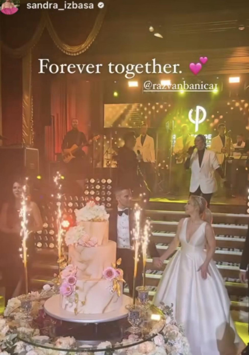 Sandra a ales o rochie de prințesă, cu trenă, amplă, decolteu în V și spatele gol, iar mirele a mers pe un costum clasic cu papion. Emoționată, mireasa a fost toată o bucurie și a împărțit asta și cu invitații, căci petrecerea de la localul de lux din București a ținut până în zori și s-a lăsat cu mult dans și voie bună.