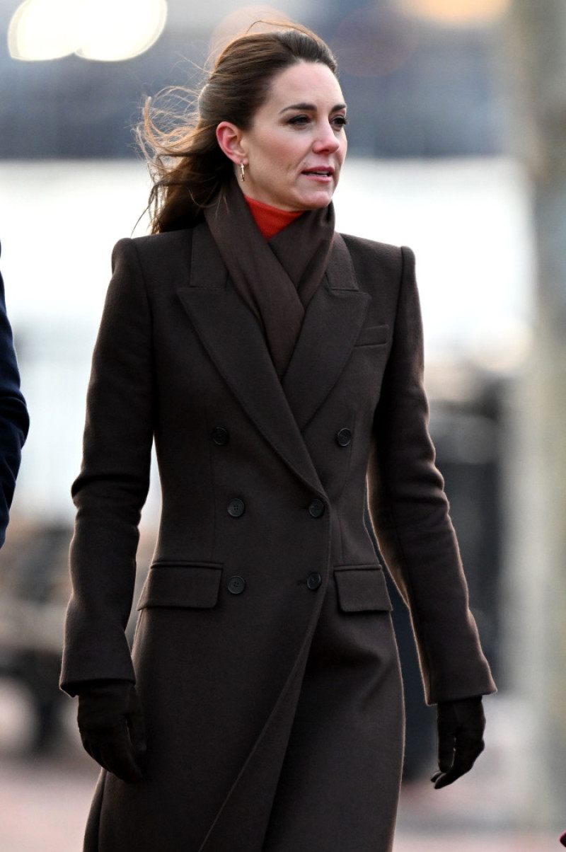 Kate a impresionat într-un costum de culoarea prunei, croit impecabil, care i-a pus în evidență silueata impresionantă, în cea de-a doua zi a vizitei lor la Boston. Prințesa a asortat o bluză cu fundă largă, roz pal, și pantofi în aceeași nuanță cu costumul.