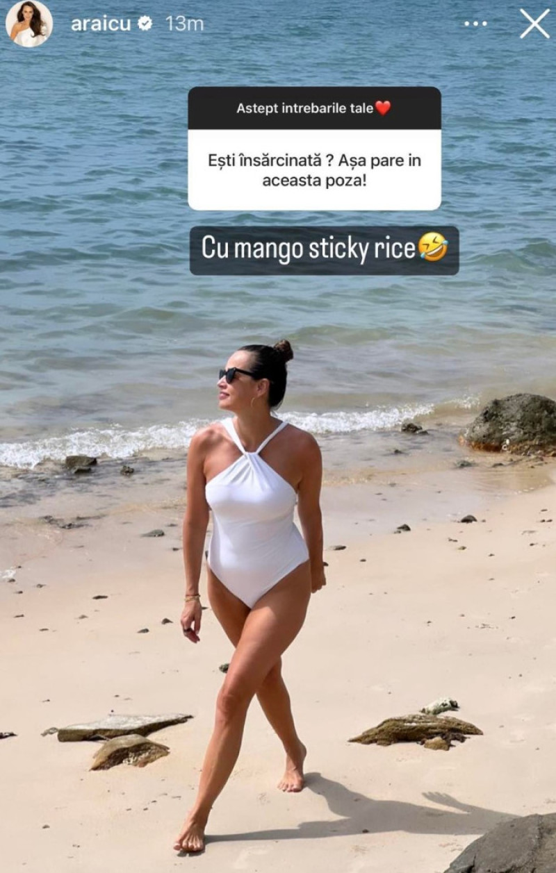 "Ești însărcinată? Așa pare în această poză", i-a scris cineva în dreptul unei imagini în care e surprinsă într-un costum de baie alb, întreg, în timp ce mergea relaxată pe plajă. Andreea a și răspuns într-un mod amuzant: "Cu mango sticky rice" (desert cu mango specific asiatic -n.r.).