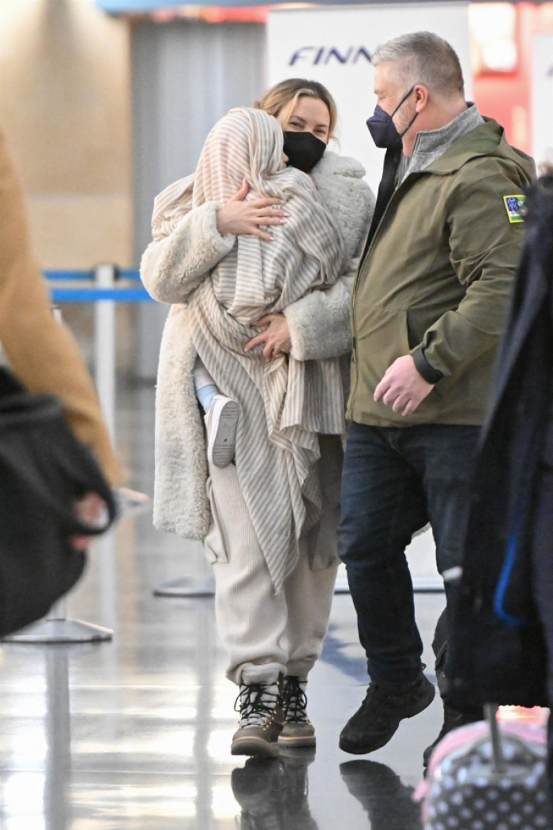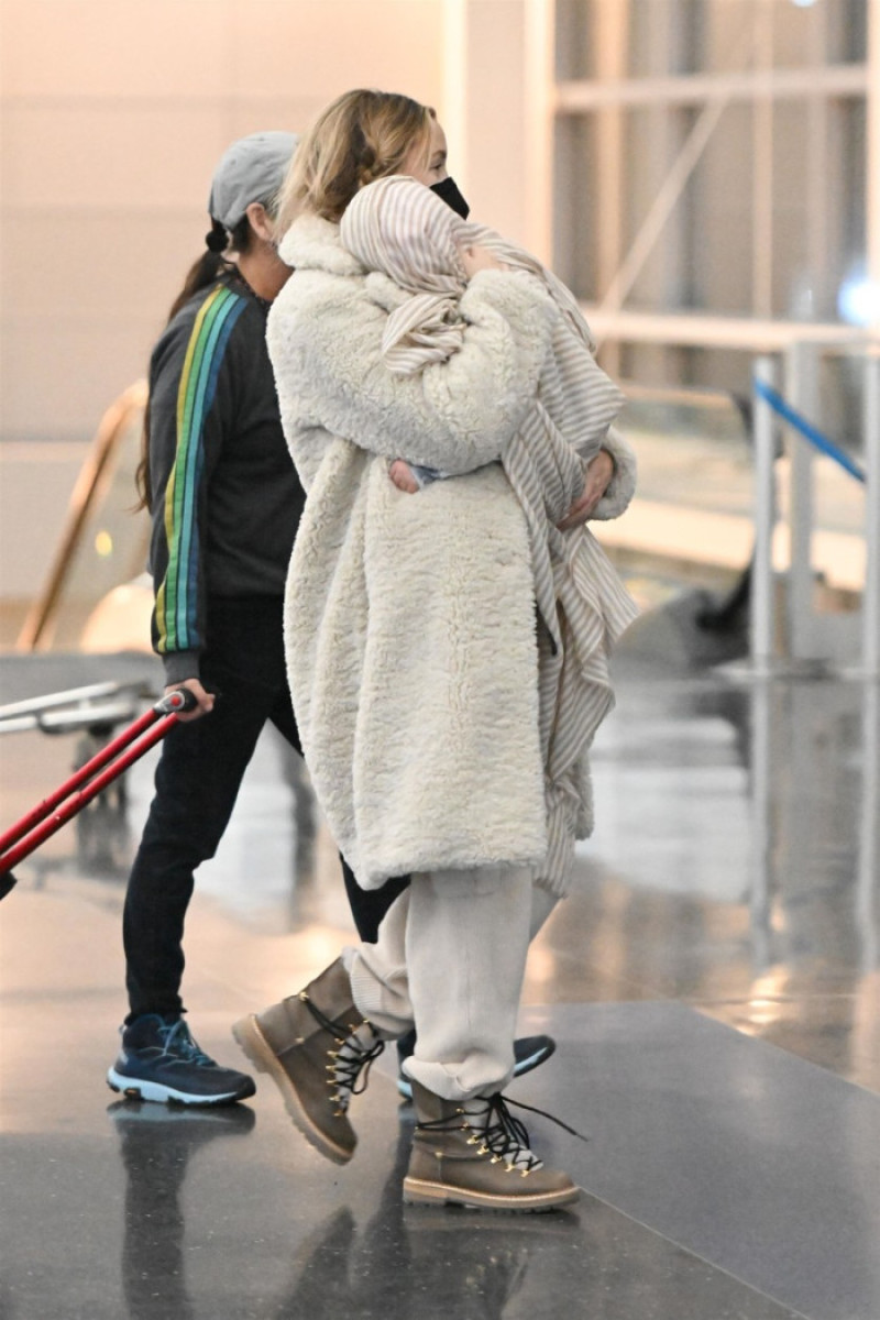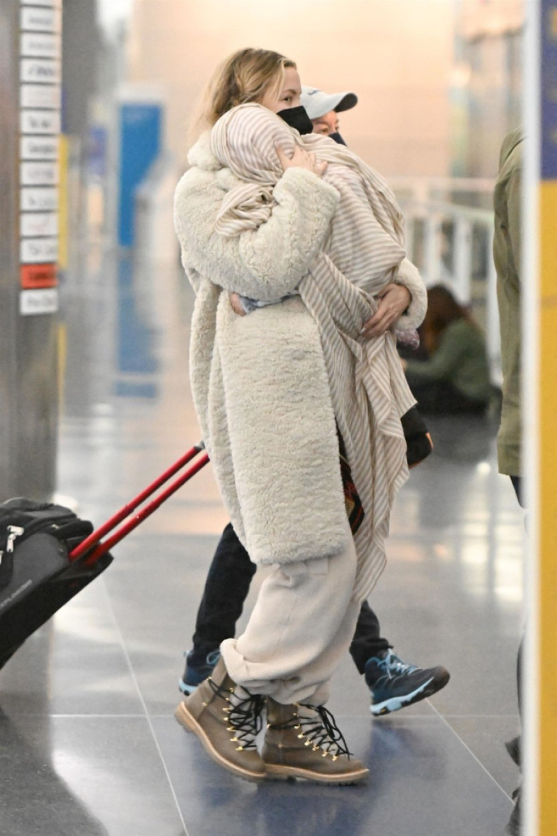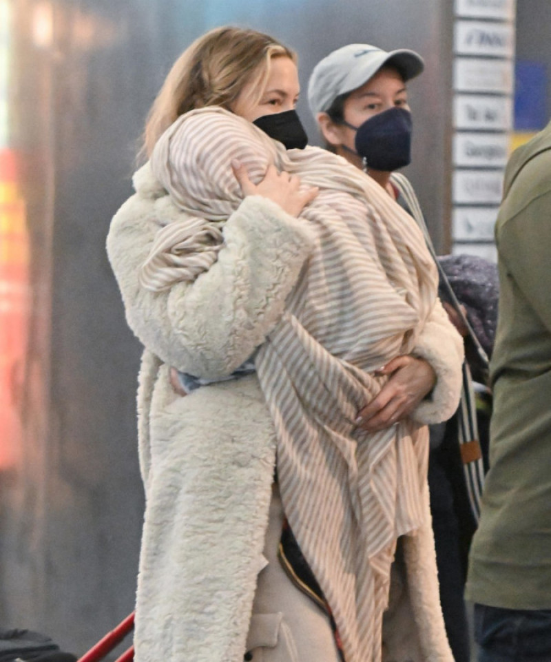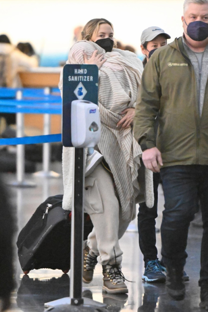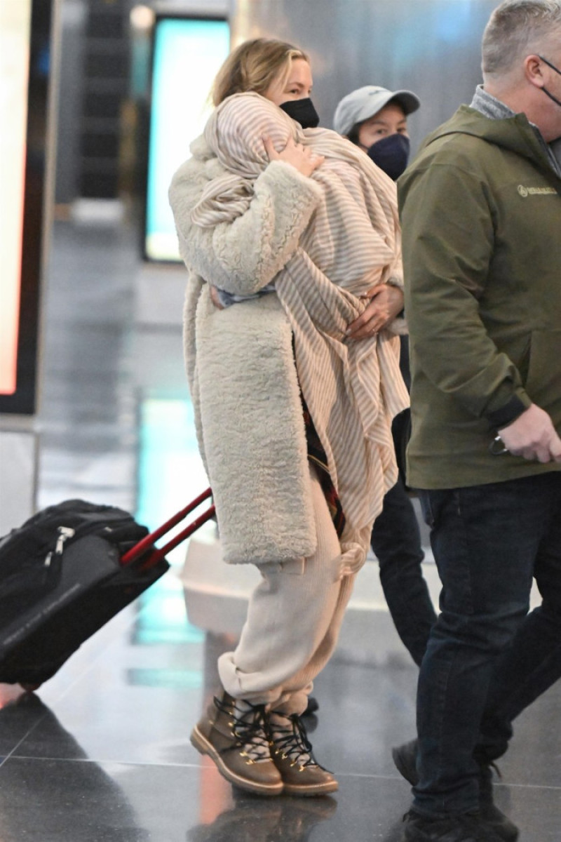 Actrița a fost fotografiată pe aeroportul JFK din New York, alături de fiica ei, Rani și de logodnicul ei, Danny Fujikawa, iar în imaginile respective, Kate Hudson apare îmbrăcată în niște pantaloni de trening, largi, pe care i-a asortat cu un palton midi, precum și niște bocanci.