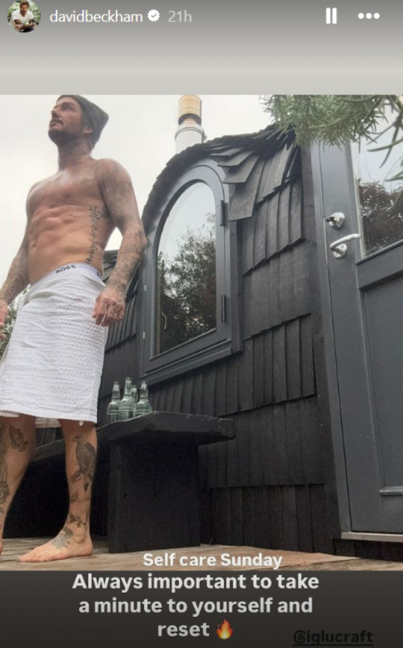 Beckham a încărcat două imagini care evidențiau fizicul său tonifiat și pătrățelele de pe abdomen cu care se poate mândri și la ani buni de când s-a lăsat de fotbal. Acesta s-a răsfățat într-o saună pe care o are acasă de vreo 6-7 ani și care costă aproape 20.000 de euro.