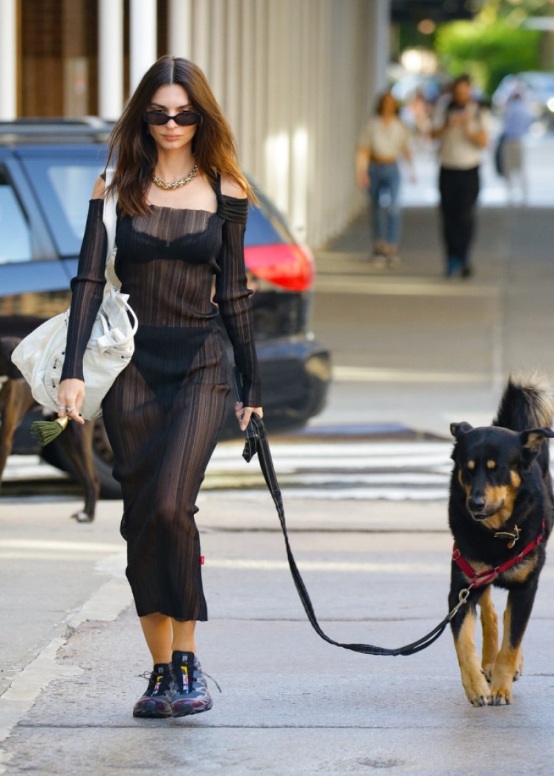 Zilele trecute, modelul a fost surprins în New York, acolo unde locuiește, în timp ce-și plimba câinele. Nimic deosebit până aici, numai că felul în care s-a îmbrăcat a întors toate capetele. Complet în negru, aceasta și-a pus o rochie transparentă peste o lenjerie intimă dantelată, care s-a văzut în toată splendoarea. Emily nu a părut deranjată de paparazzi, obișnuită fiind să fie pozată din toate unghiurile.