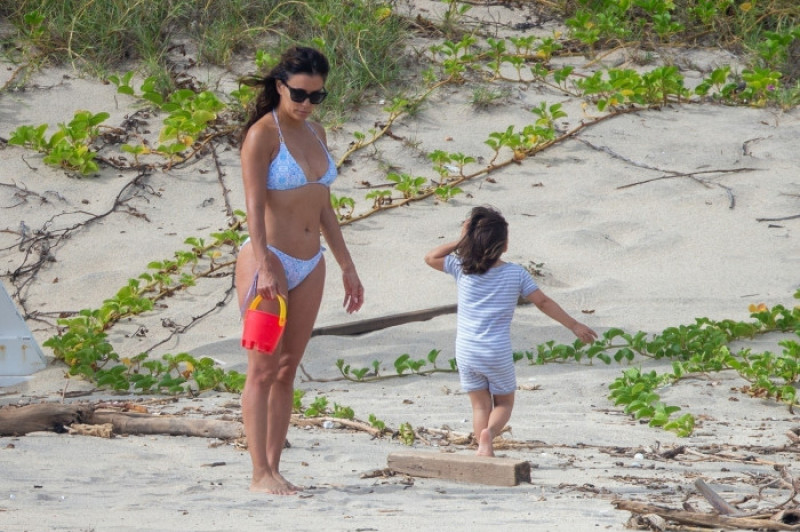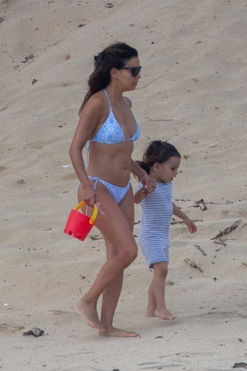 Îmbrăcată într-un costum de baie albastru, din două piese, Eva Longoria și-a etalat silueta clepsidră și abdomenul cu pătrățele în timp ce îl ajuta pe fiul ei Santiago să adune scoici din nisip.