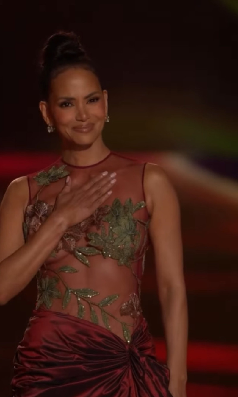 Imaginea publicată pe rețeaua X o surprinde pe Halle cocoțată pe o platformă plutitoare, deasupra apelor turcoaz ale Pacificului, purtând un costum de baie auriu. Actrița și-a completat ținuta cu o eșarfă alb-negru, ochelari de soare și câteva bijuterii argintii.