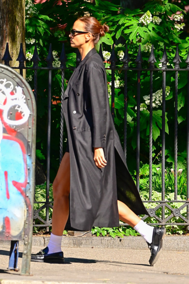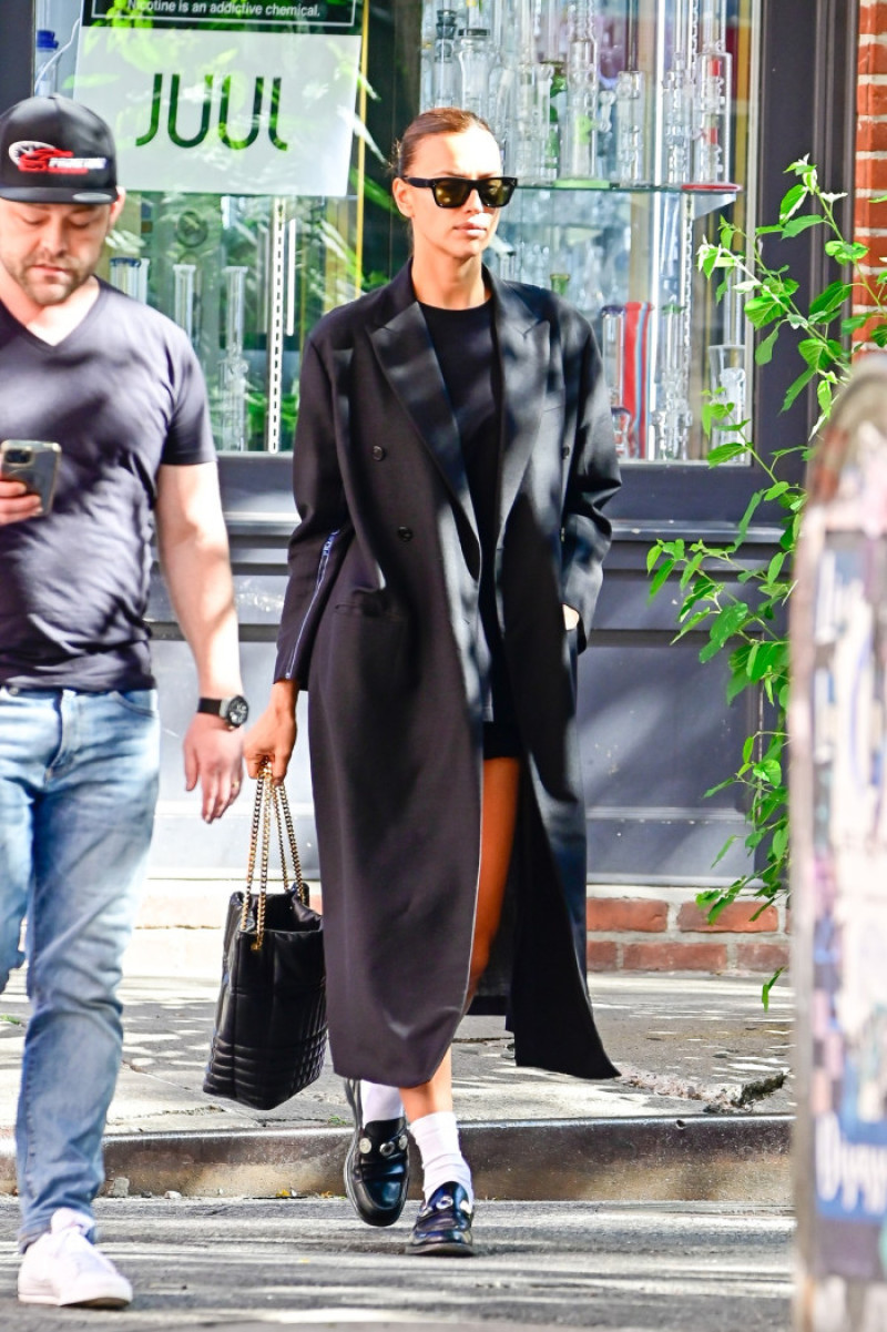 Shayk a transformat străzile orașului american în podium, defilând cu nonșalanță într-o ținută spectaculoasă. Vedeta și-a etalat picioarele lungi și bronzate într-o pereche de pantaloni foarte scurți negri, pe care i-a combinat cu un top și un trenci în aceeași nuanță. Supermodelul și-a completat look-ul cu o pereche de șosete lungi albe și o pereche de pantofi eleganți cu talpă joasă. De asemenea, aceasta și-a prins părul castaniu într-un coc la spatele, lăsându-și la vedere ochelarii de soare negri. Irina nu a uitat nici de geantă nelipsită, astfel că și-a asortat la ținută una dintre poșetele de lux, din piele neagră, cu lanțuri aurii.