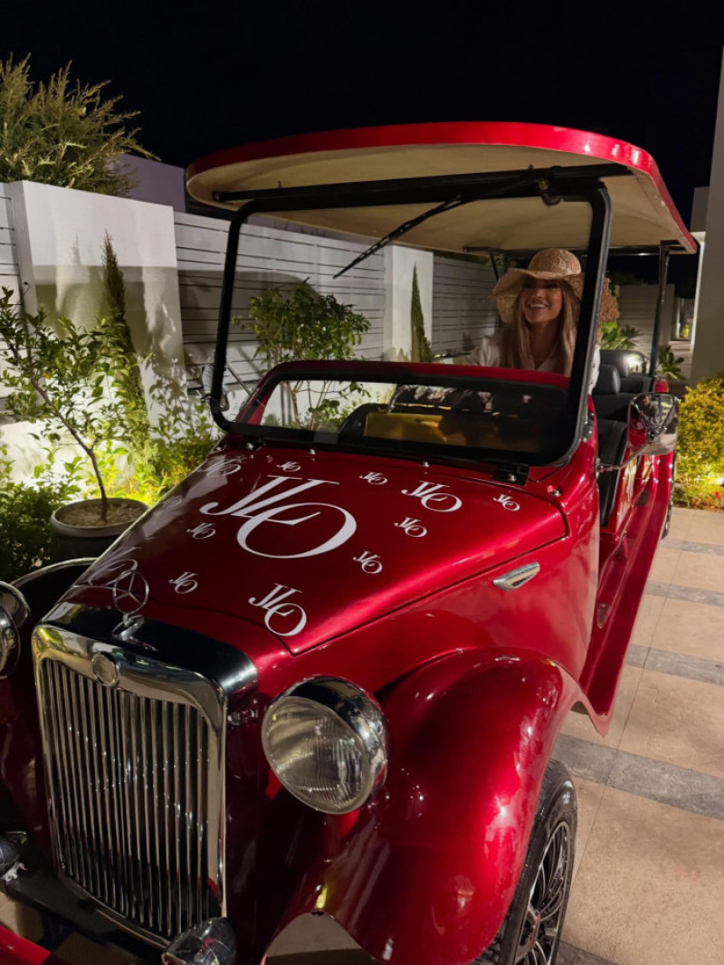 Vedeta a fost surprinsă și într-o ținută lejeră, purtând o rochie albă cu imprimeuri subtile, în timp ce poza lângă o bicicletă vintage sau într-o mașină personalizată cu inițialele „JLO”.