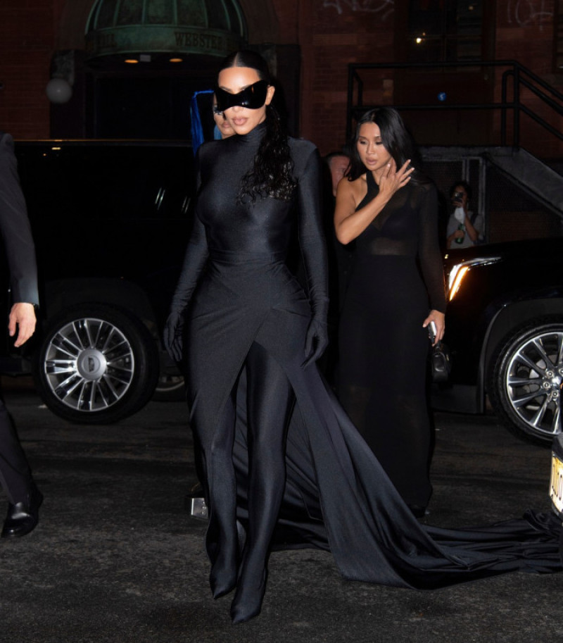 Procesul a fost împărtășit pe Instagram, iar look-ul a putut fi văzut la petrecerea de după gala MET, unde Kim a renunțat la mască în detrimenul unor ochelari ce amintesc de cei purtați de Batman.