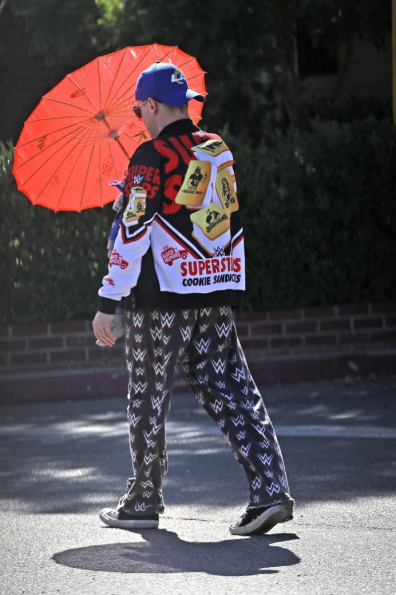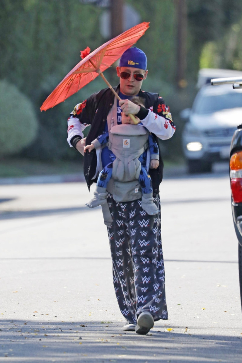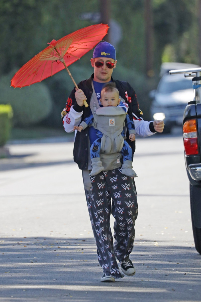 Actorul a optat pentru un outfit inedit, în care să nu fie ușor recunoscut. Cu o umbrelă portocalie care să-i protejeze de soare, și îmbrăcat cu pantaloni largi sport, jachetă si o șapcă pe cap, Macaulay l-a purtat pe Dakota la piept într-un port bebe.