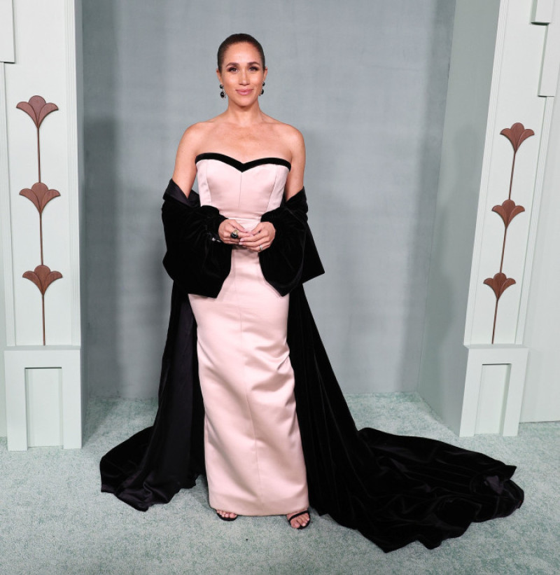 Pentru eveniment, Meghan a ales o rochie fără bretele, cu un aer dramatic și sofisticat. Ținuta a fost pusă în valoare de un decolteu în formă de inimă, conturat cu detalii negre, și de un șal negru care se prelungea într-o trenă amplă, cu efect spectaculos.