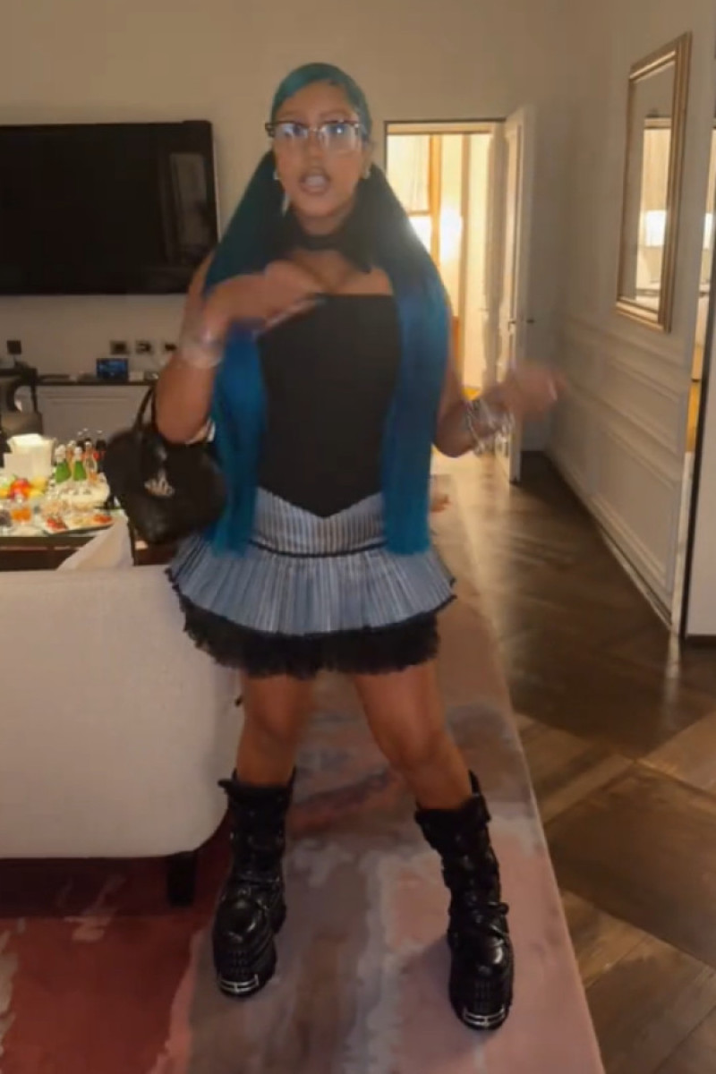 Fiica lui Kanye West a purtat un corset negru, fustă mini din denim, cizme cu platformă și cozi împletite vopsite în albastru. Look-ul ei "a aprins" instantaneu rețelele sociale.
