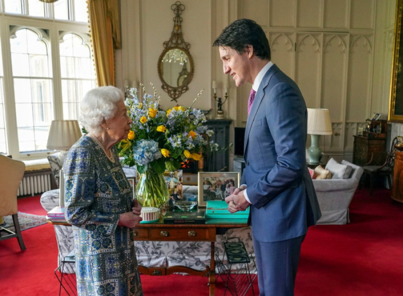 Majestatea Sa, care este și regina Canadei, a fost fotografiată stând în picioare și zâmbind călduros premierului Trudeau, purtând o rochie cu model albastru și alb, având un strop de galben. Domnul Trudeau a fost văzut și râzând în timpul petrecut cu Regina din camera de zi din Oak Room.