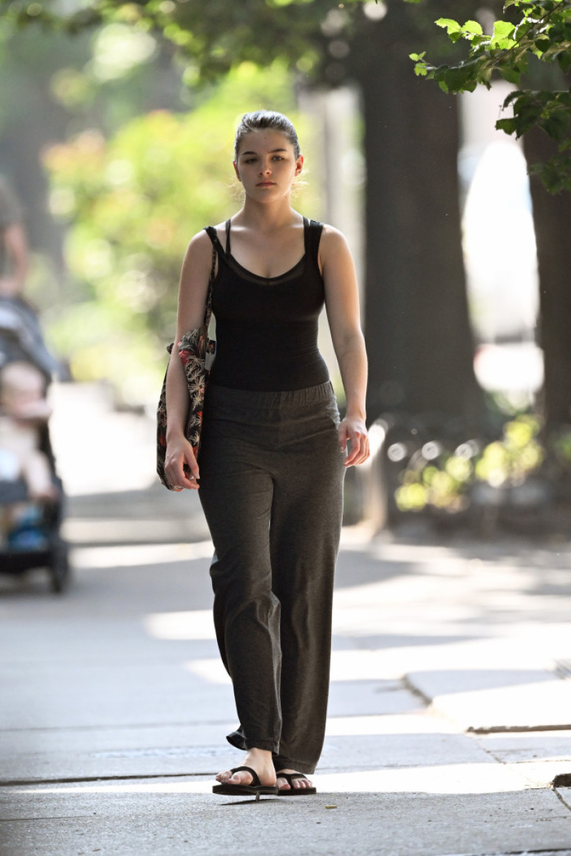 Suri Cruise, extrem de serioasă, a purtat o ținută sport neagră, cu șlapi, și-a prins părul într-o coadă înaltă și a optat pentru un look fără machiaj pentru ieșirea ei matinală în Manhattan.