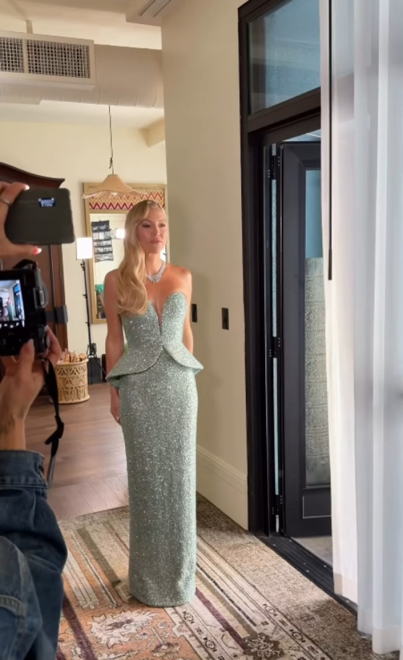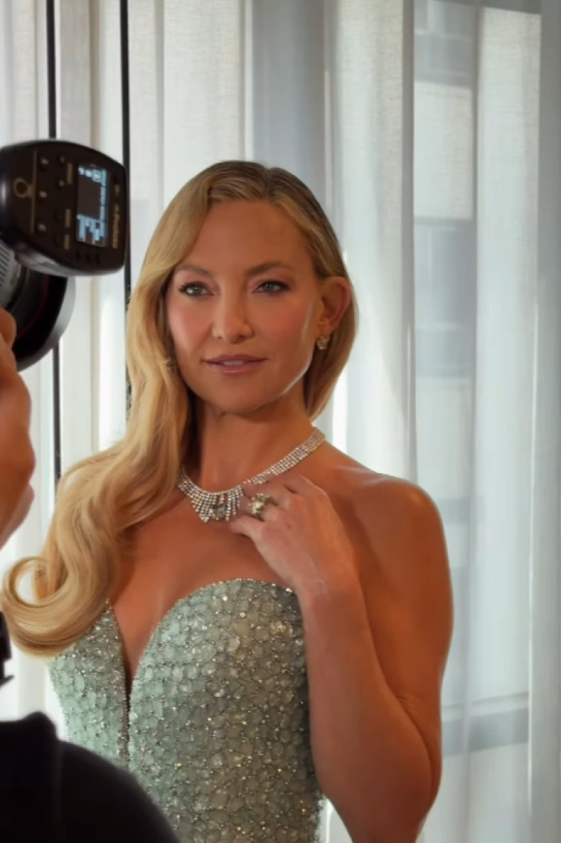 Kate Hudson (46 de ani) a strălucit într-o rochie verde-jad, fără bretele, semnată Armani Privé, cu o siluetă sculptată ce amintea de o sirenă și decorată cu pietre strălucitoare care reflectau lumina asemenea apei oceanului. Look-ul ei de pe covorul roșu a fost completat de un styling inspirat din glamourul epocii de aur a Hollywood-ului: părul blond, cu cărare într-o parte, a fost aranjat în bucle ample, lăsate elegant pe umărul drept. Bijuteriile argintii i-au pus în valoare decolteul și linia romantică a rochiei. Diamantele purtate de Kate Hudson costă fabuloasa sumă de 35 de milioane de dolari, scriu publicațiile internaționale precum InStyle și E!News.