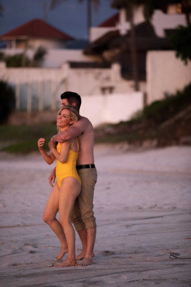 The Playboy model turned travel blogger looked incredible in a bright yellow bikini while shirtless Los Angeles-based Nathan showed off his physique in a pair of khaki rolled-up pants.