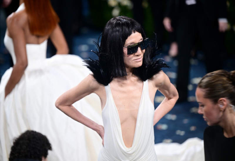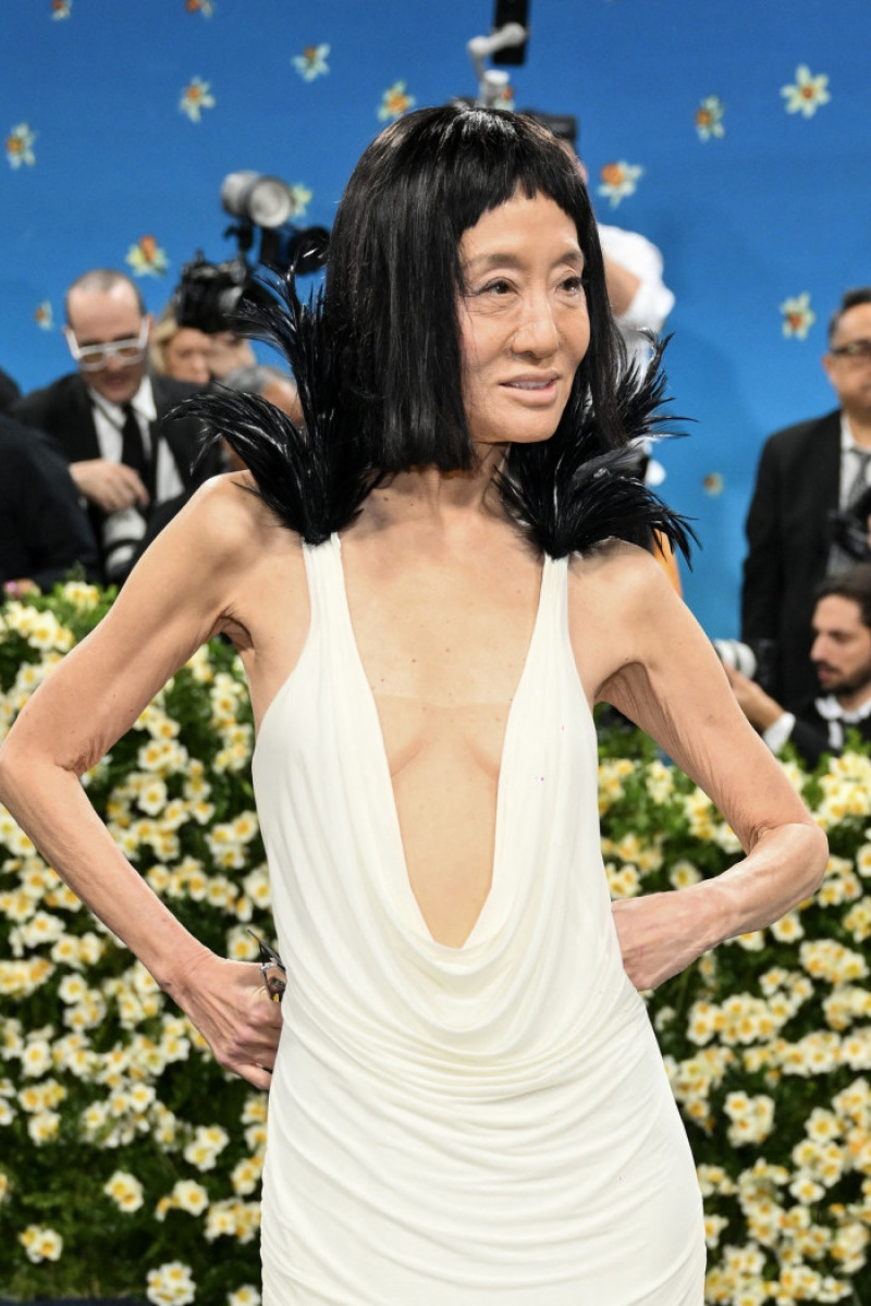 La celebrul eveniment de la New York, Vera a purtat o perucă, cu breton foarte scurt, și mare parte din timp și-a ascuns chipul în spatele unor ochelari de soare supradimensionați. Wang a îmbrăcat o rochie albă cu un decolteu îndrăzneț, până aproape până la talie, cu pene negre și gri care au dat o notă unică ținutei.