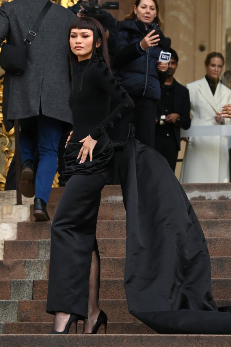 Zendaya a purtat un body ce i-a subliniat silueta subțire și o impresionantă fustă neagră cu o trenă spectaculoasă, la care a asortat pantofi cu toc cui.