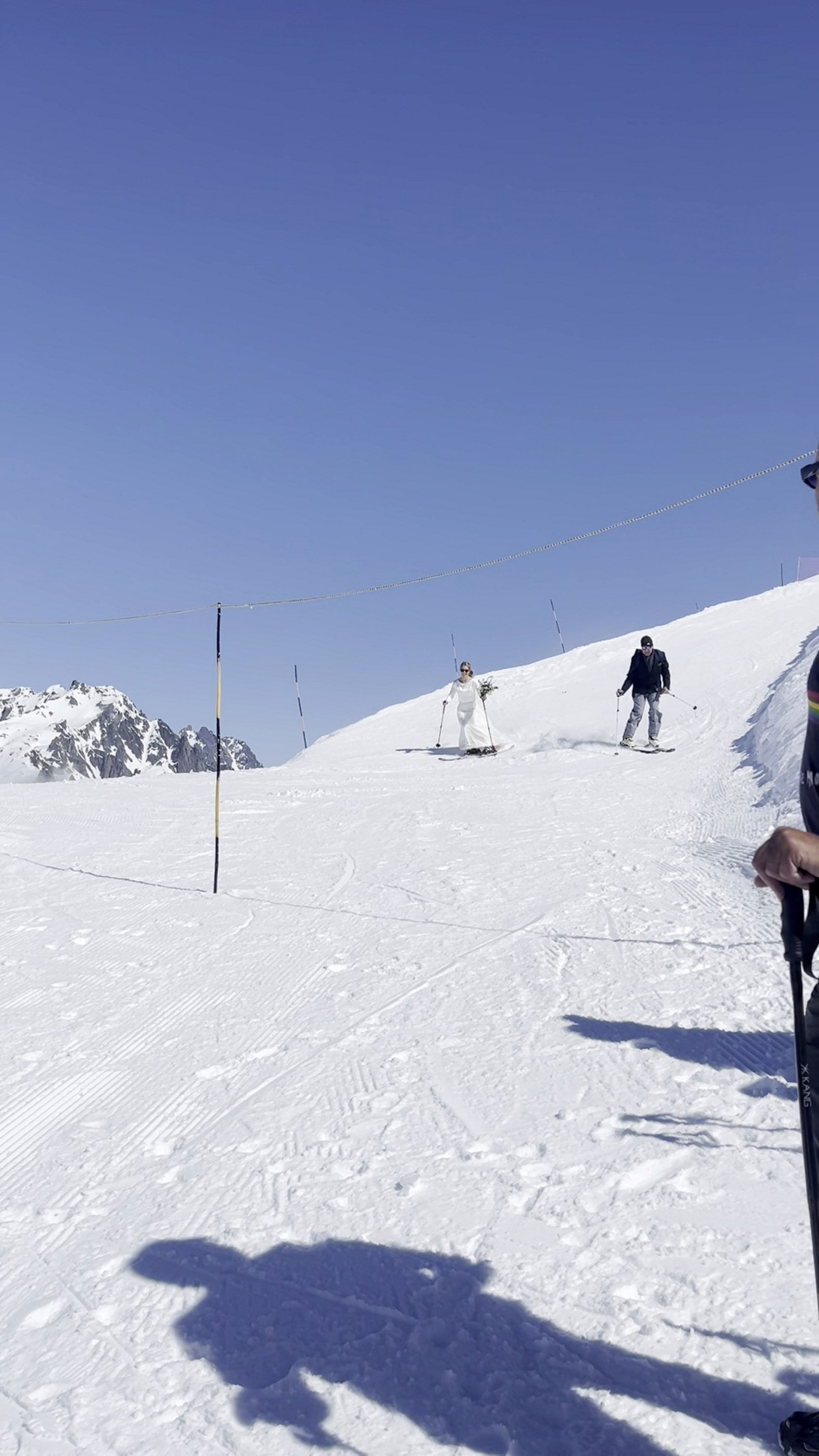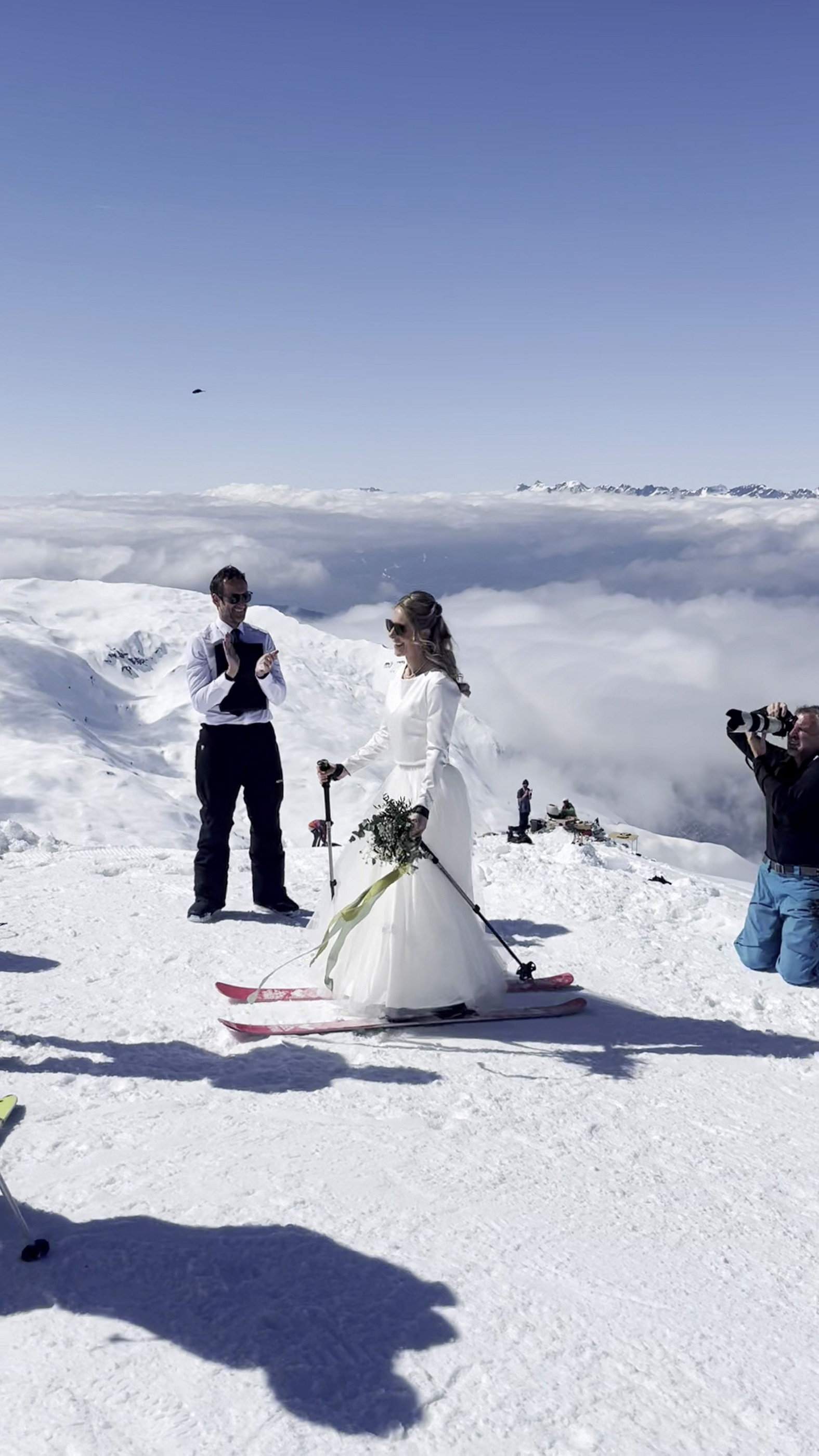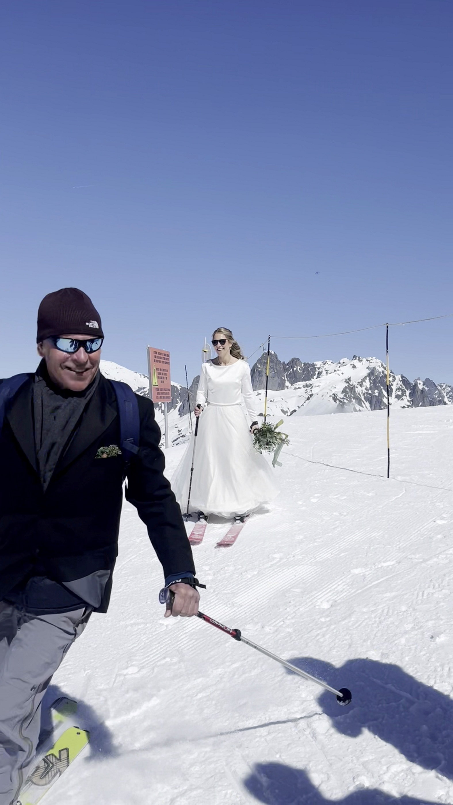 Nuntă de poveste la 2.500 de metri altitudine. Mireasa a schiat pe culoar spre altar pe vârful Mont Brévant
