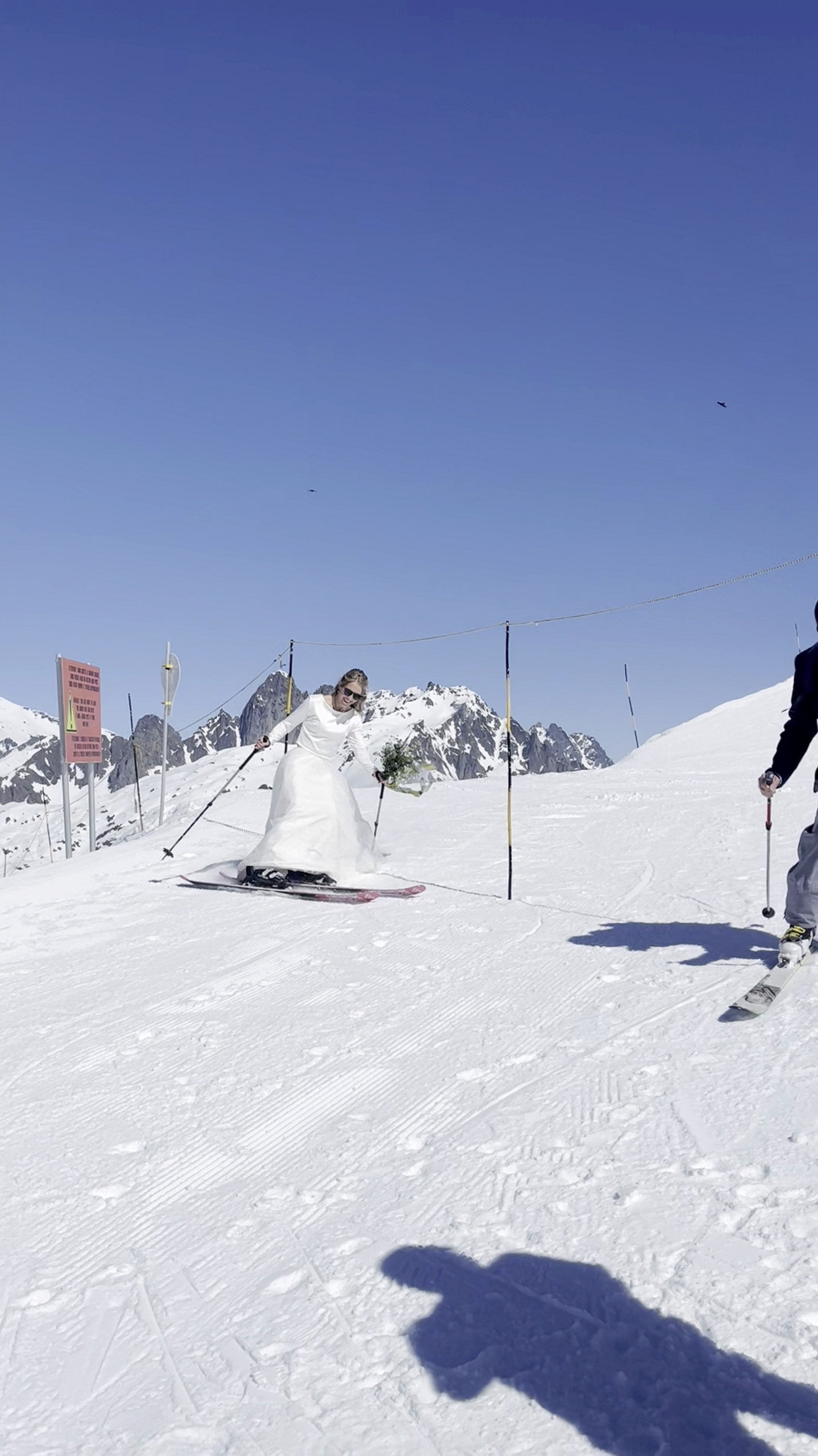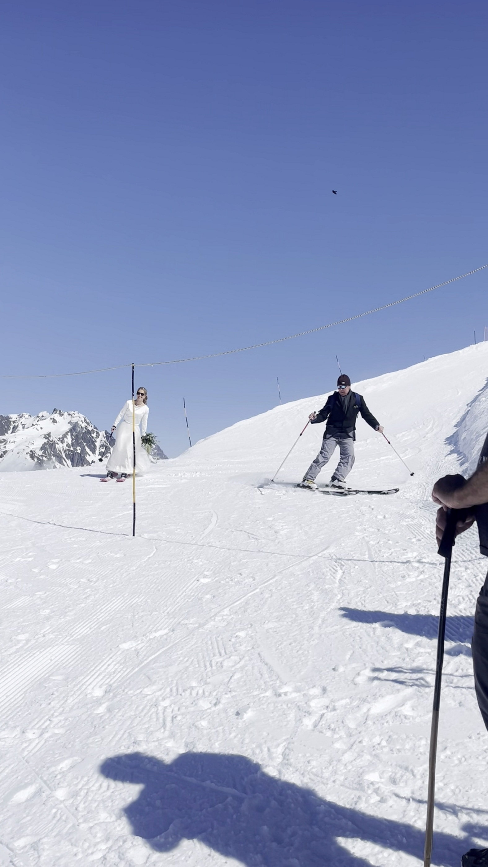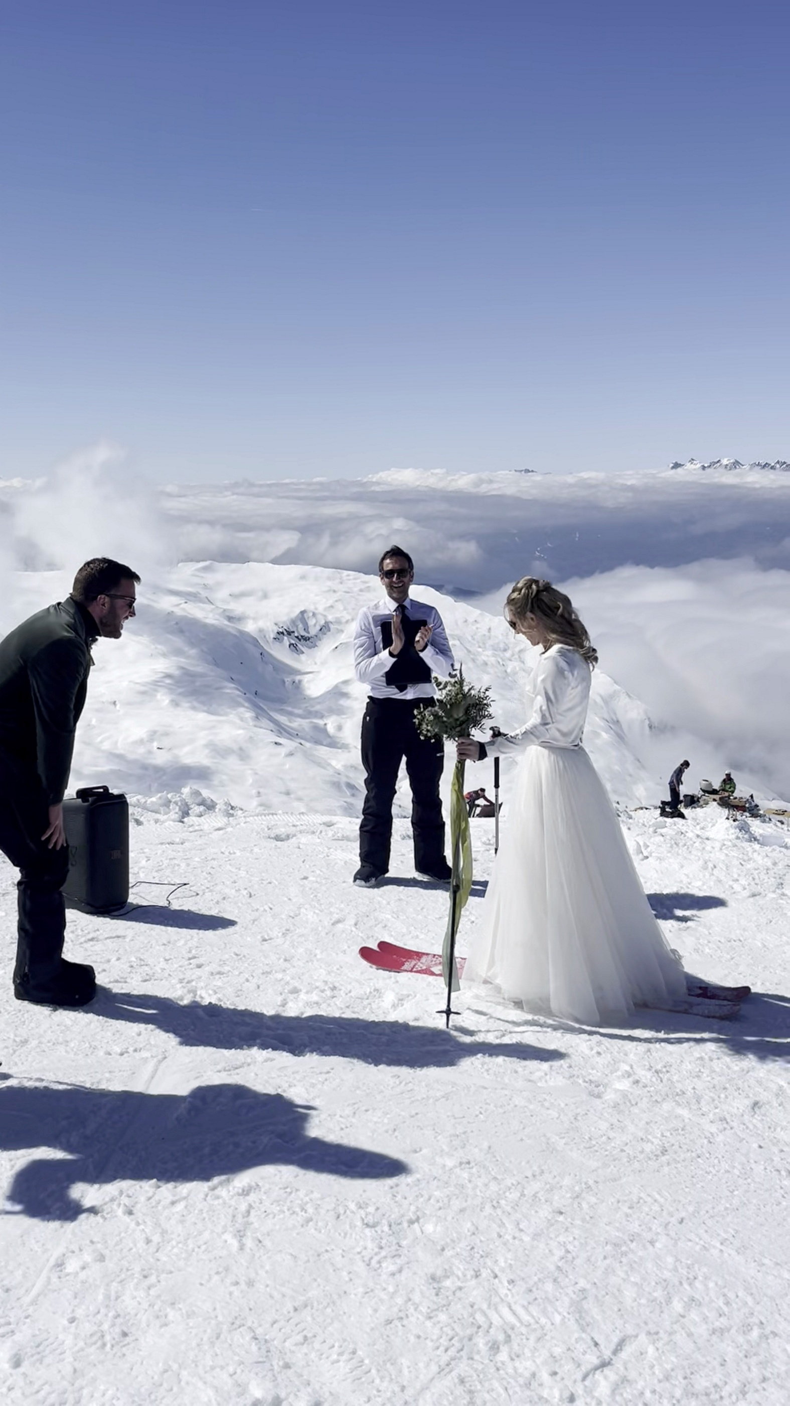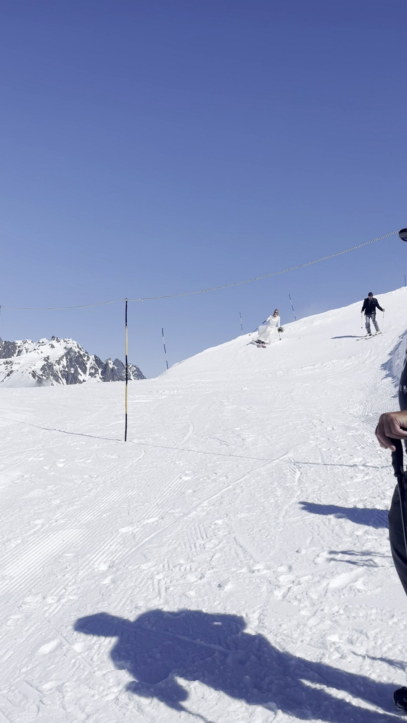 Nuntă de poveste la 2.500 de metri altitudine. Mireasa a schiat pe culoar spre altar pe vârful Mont Brévant