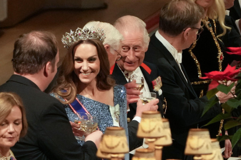 Prima apariție memorabilă a avut loc la banchetul de stat organizat în onoarea președintelui Germaniei, Frank-Walter Steinmeier, la Castelul Windsor. Kate a ales o rochie albastră cu paiete semnată Jenny Packham, completată de o tiară spectaculoasă, Oriental Circlet, o piesă istorică rar purtată. Alegerea culorii nu a fost întâmplătoare: albastrul este frecvent asociat cu Germania, iar tiara, comandată inițial de prințul Albert pentru regina Victoria, a creat o punte simbolică între istoria britanică și legăturile europene.