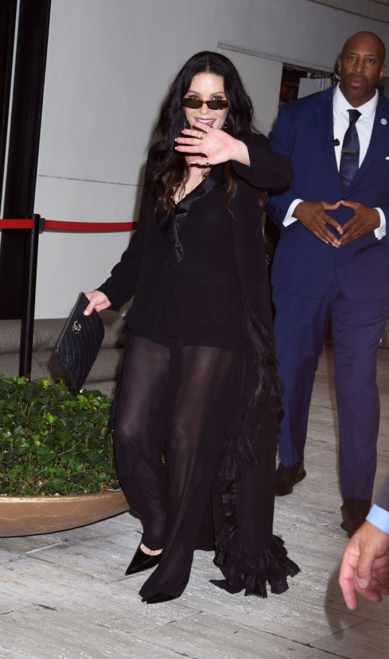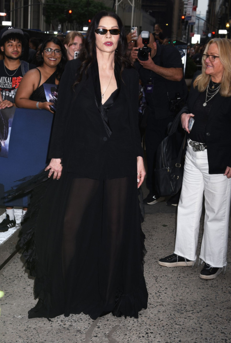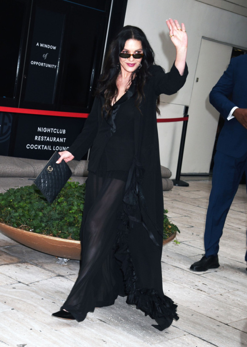 Soția lui Michael Douglas a încântat privirile într-o ținută neagră, inedită, compusă dintr-un sacou subțire, decoltat, pantaloni transparenți și un trenci cu volane. Zeta a accesorizat ochelari de soare negri, iar părul și l-a coafat în bucle lejere.